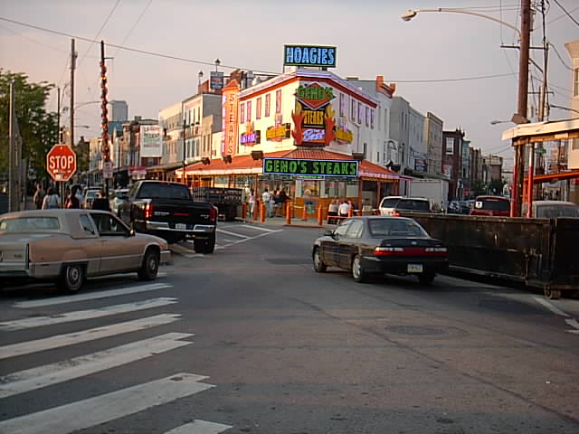 steps of the museum entrance. Another view looking past the museum's fountain at the downtown skyline. A view to show how the steps have intermittent wide stoops between steps. Arriving at "Pats", hungry for one those famous Philadelphia Cheese Steaks. It is located where 9th Street crosses Wharton Street and Passyunk Avenue. As you can see, Pat's competition, Geno's is right across the street. Geno's was embroiled in some controversy recently with the "Order In English Only Sign". Philadelphia was going to pass an ordinance forbidding that type of sign. Just to left is the "Capitol Playground", where kids were playing basketball and got into a fight when we were at Pat's. The fight ended when an unmarked and marked stopped there as they were patrolling. What to order? Checking out the menu and celebrity photos at "Pats".